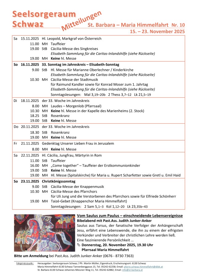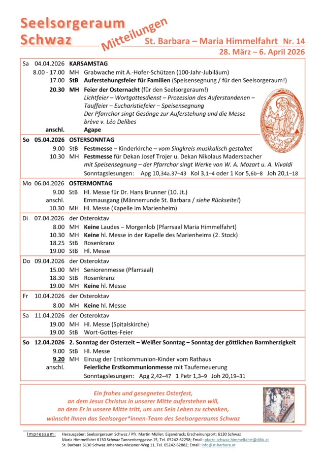 Wir geben ein wöchentliches Mitteilungsblatt mit den Gottesdiensten und mit Hinweisen auf das Pfarrleben heraus, das in der Pfarrkirche und in der Spitalskirche zur freien Entnahme aufliegt.