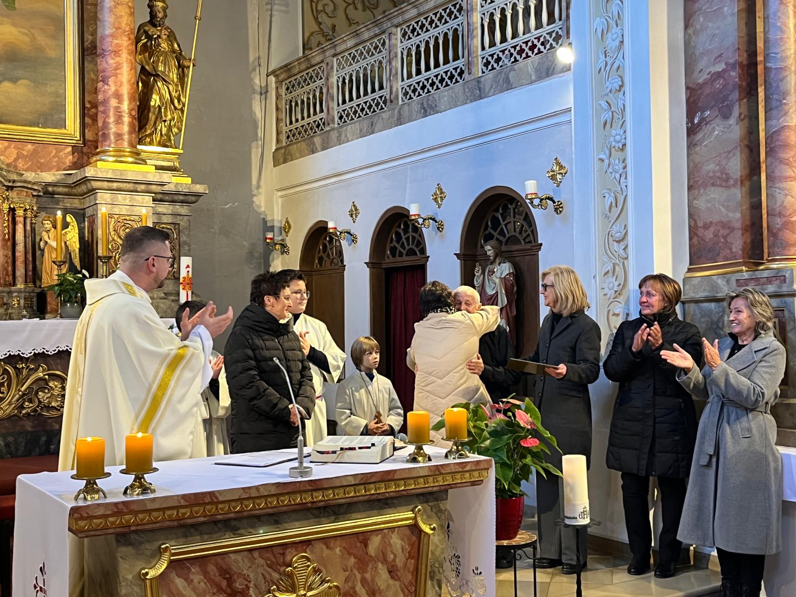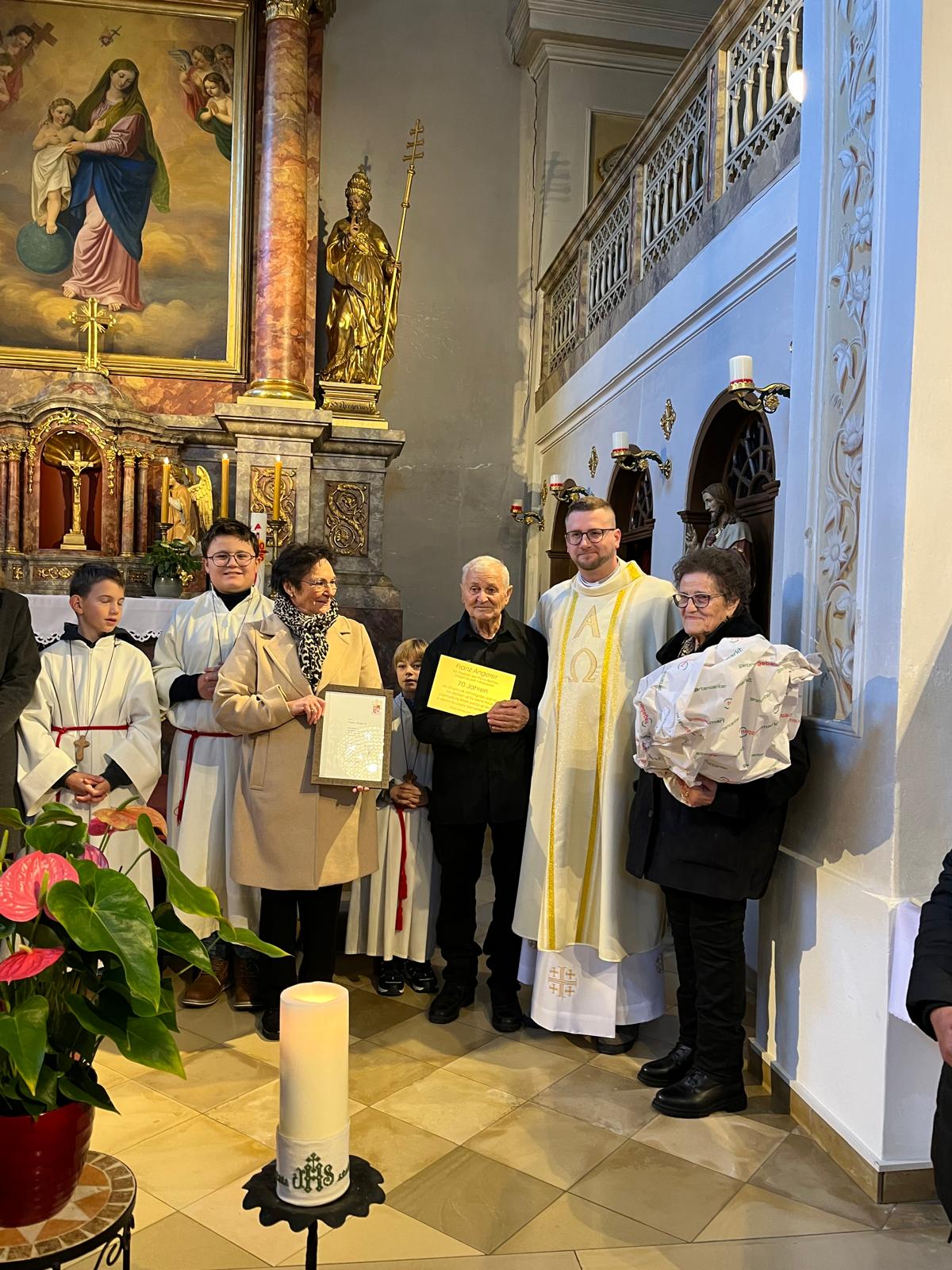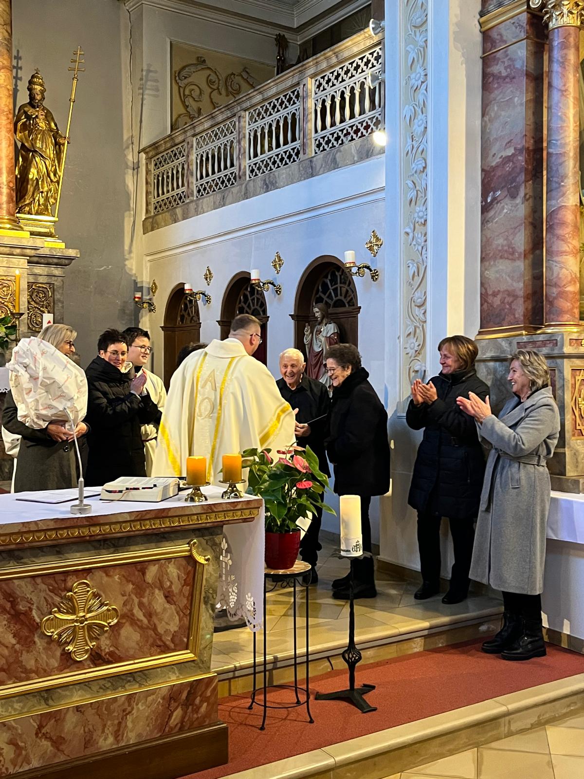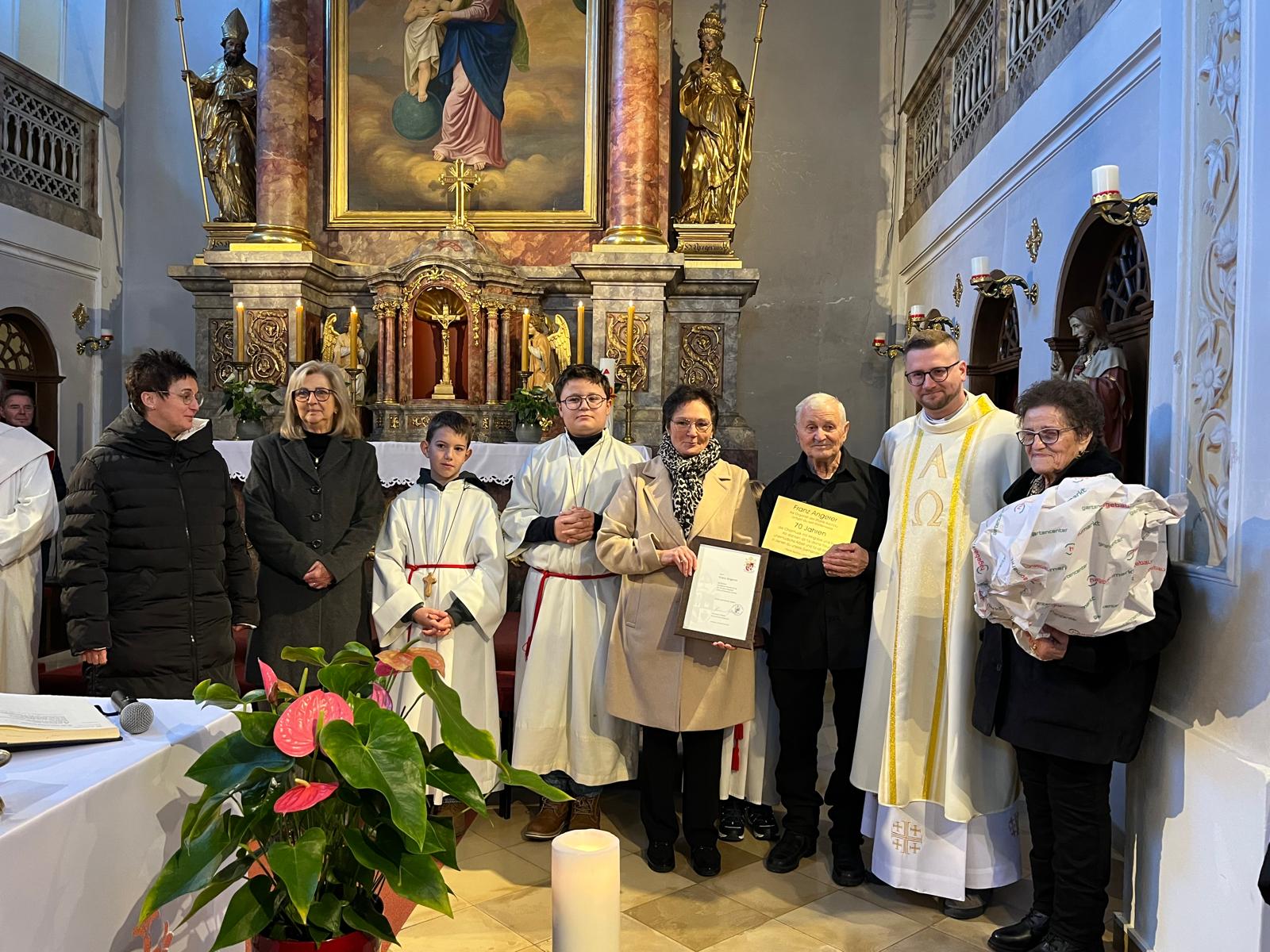 Ein Höhepunkt einer Cäciliafeier sind die Ehrungen von fleißigen Sängerinnen und Sängern. So wurden Julia Geisler für 35 Jahre und Helga Blunder für 25 Jahre Mitgliedschaft ausgezeichnet. Unglaubliche 75 Jahre beim Kirchenchor und 70 Jahre an der Orgel ist unser Franz Angerer. Dafür gab es eine herzliche Gratulation und viel Lob von unserem Pfarrer Piotr: „Lieber Franz, dafür dass du gemäß der Lehre Jesu deine Talente nicht in der Erde versteckt und vergraben hast, sondern im Gegenteil, sie ständig vermehrst, indem du zu seiner Ehre und unserer Freude spielst und singst, dafür dass du dabei keine Mühen scheust und dafür, dass wir uns auf dich verlassen können, möchten wir dir heute danken.“ Im Jahre 2026 soll es dann auch noch eine diözesane Auszeichnung, das Verdienst- und Ehrenzeichen für Franz geben.