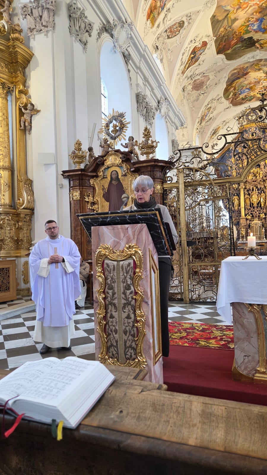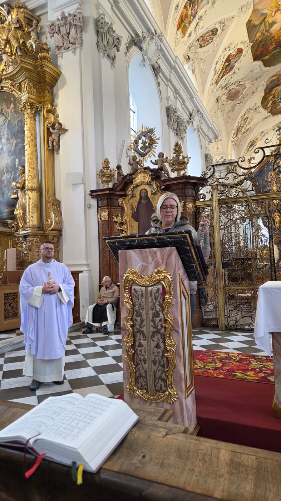 Nach Ankunft im Stift Stams feierten wir um 10:00 Uhr eine gemeinsame hl. Messe in der prachtvollen Stiftskirche. Das Thema der Messe lautete „Mutter, die unter dem Kreuz steht“. Dabei wurde deutlich, dass nicht nur damals Maria unter dem Kreuz ihres Sohnes stand, sondern auch heute viele Mütter in ähnlicher Weise Leid tragen – etwa, wenn eine Tochter an Krebs erkrankt, ein Sohn der Sucht verfällt oder wiederum die Ehe eines Kinder zerbricht.