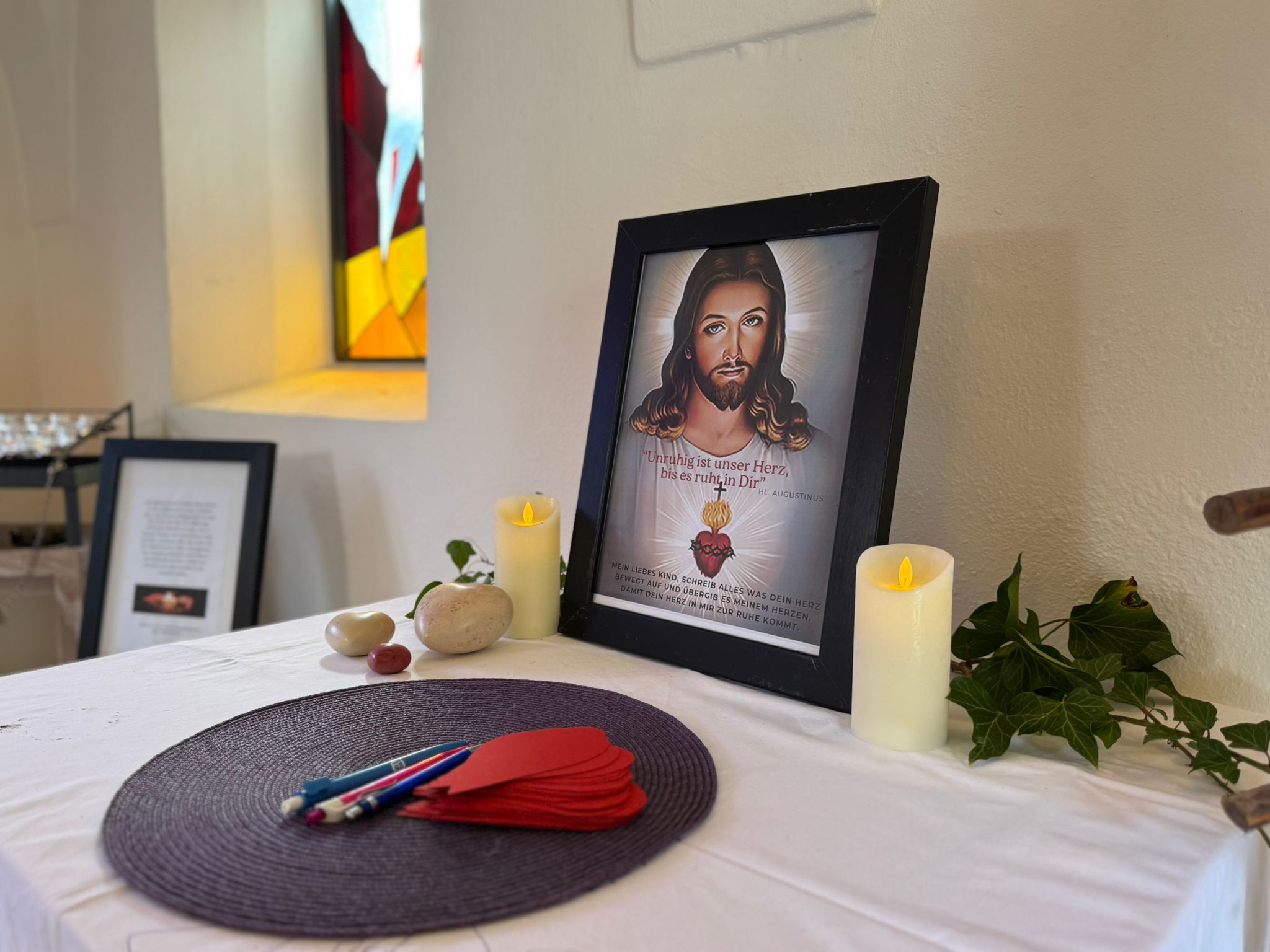 Ihr seid herzlich eingeladen, Weihrauch zu entzünden, Kerzen anzuzünden und auf kleinen Herzen alles aufzuschreiben, was das eigene Herz bewegt – als Zeichen des Vertrauens und der Hingabe an Jesus.